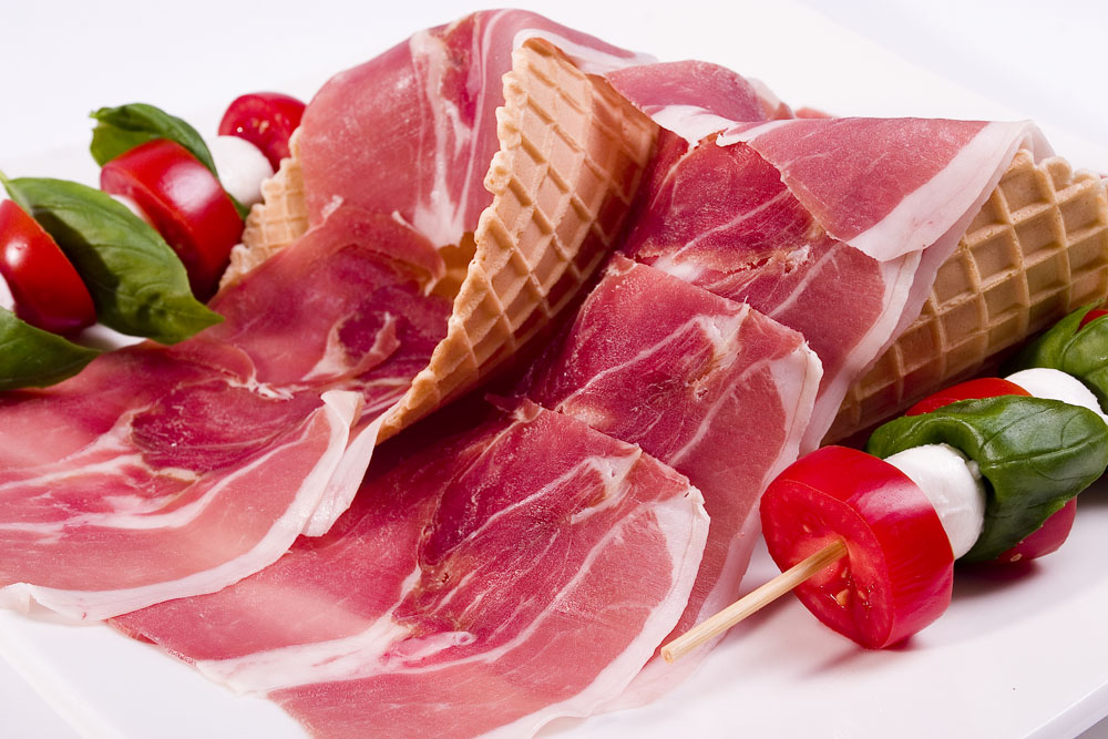 Prosciutto di suino S.Daniele senza osso su wafer salato e spiedini di mozzarella di bufala